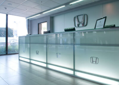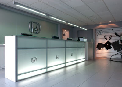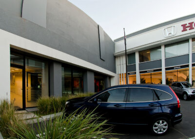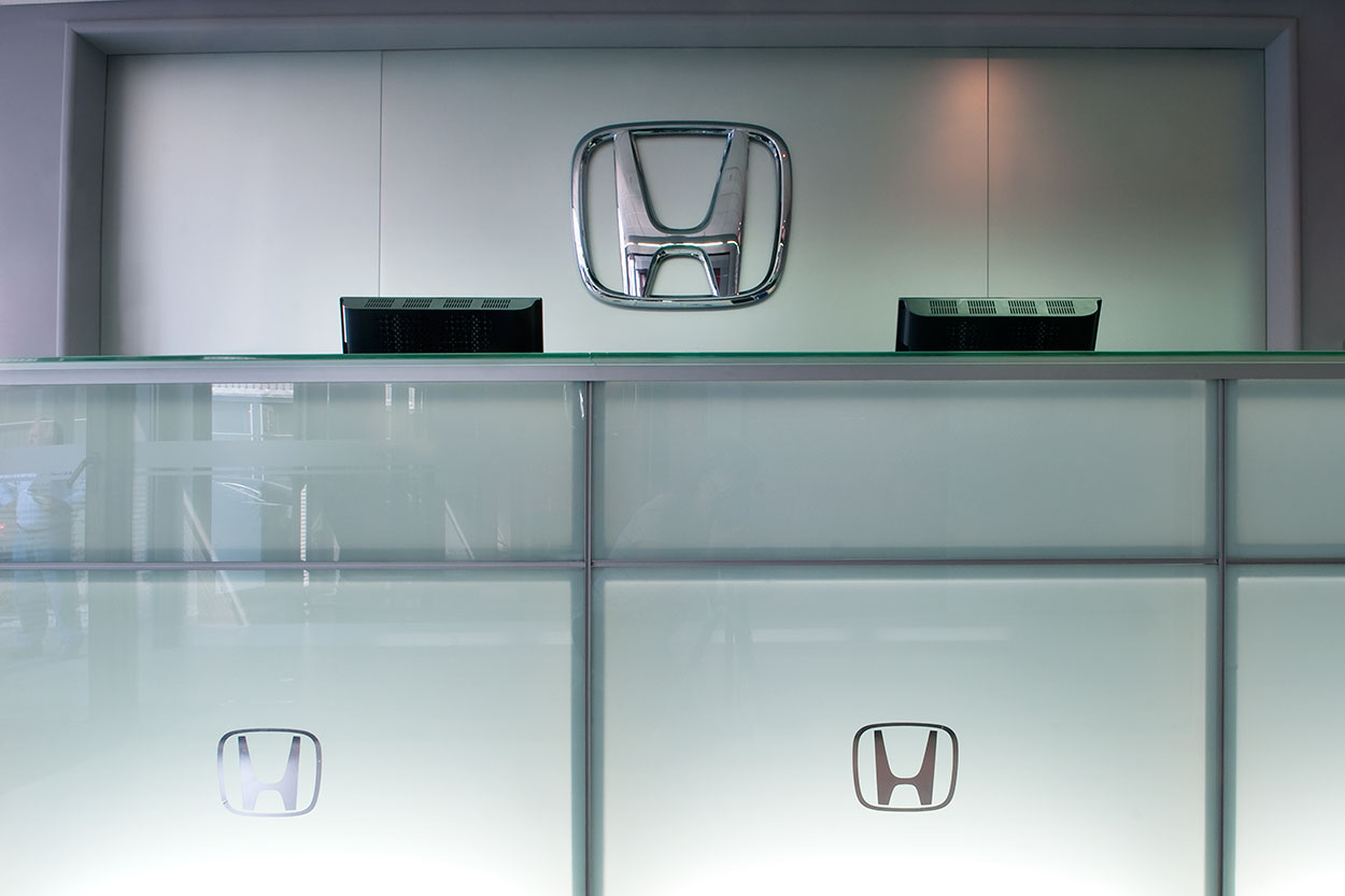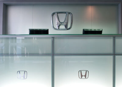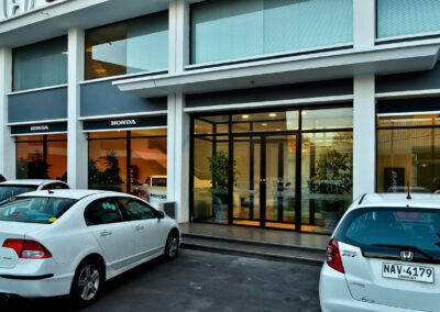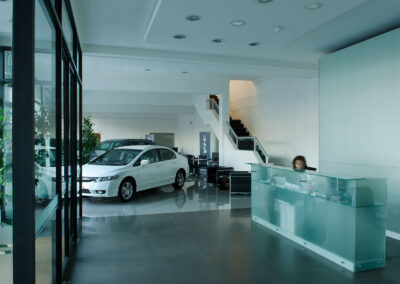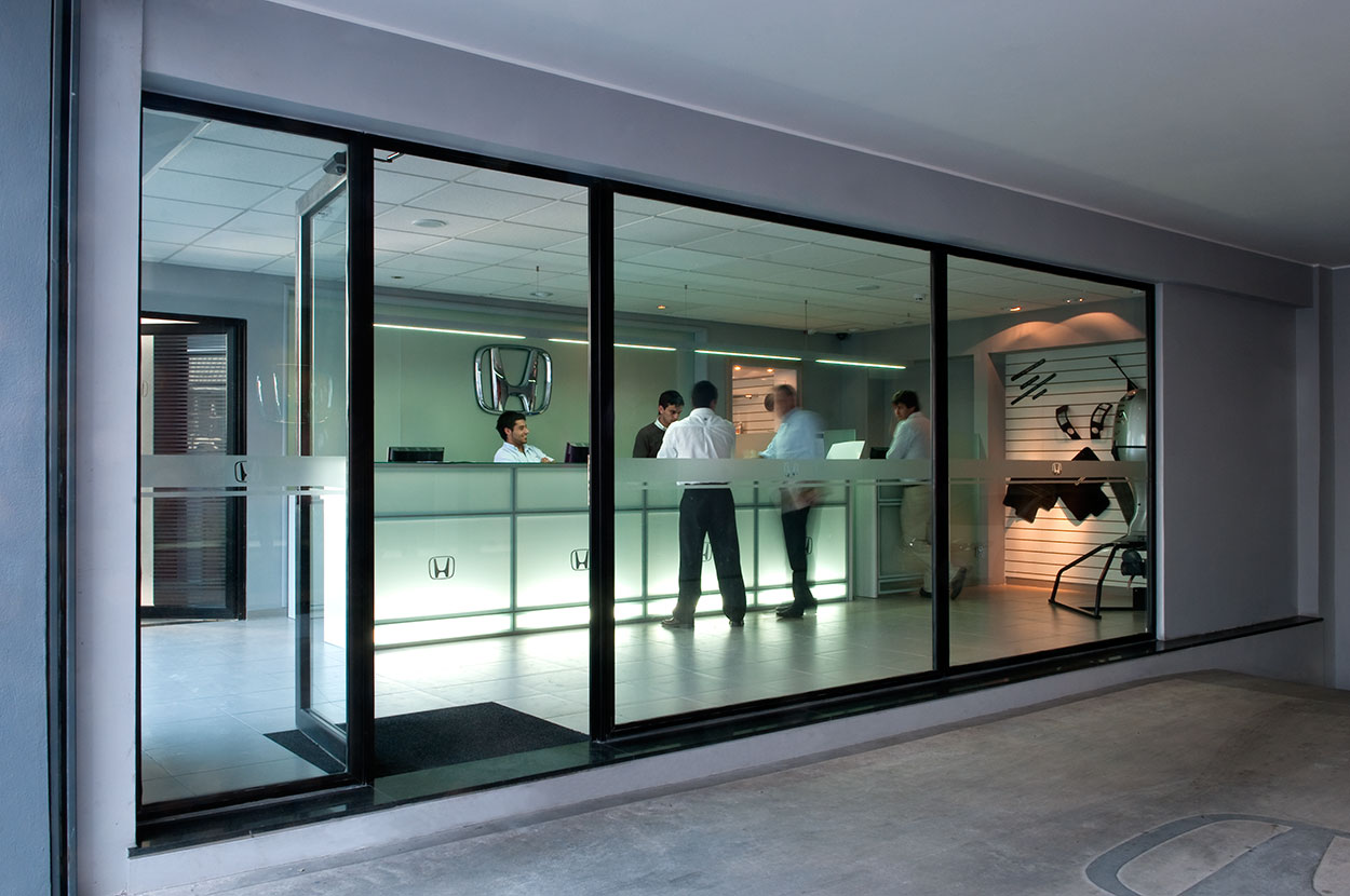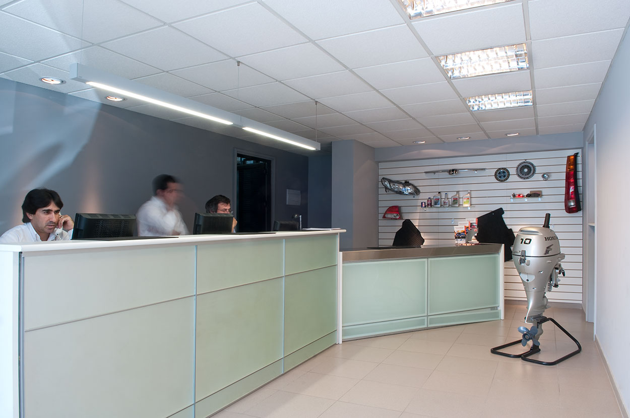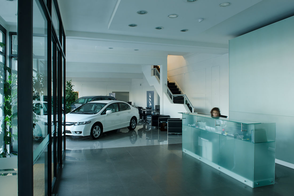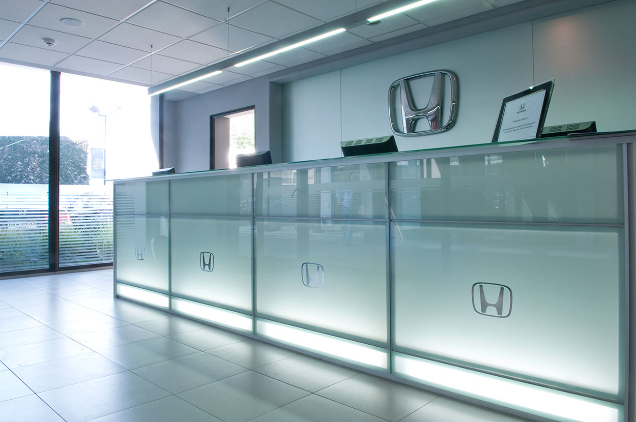Reforma integral de planta acceso y área de repuestos de sede central de Honda Automóviles. Se libera el área de exhibición, renovando pavimentos, revestimientos, fachada integral, área de control de seguridad de acceso y sistemas de iluminación. En el área de repuestos se opta por un mobiliario distinto, más asociable a una joyería que a un expendio de repuestos para autos.